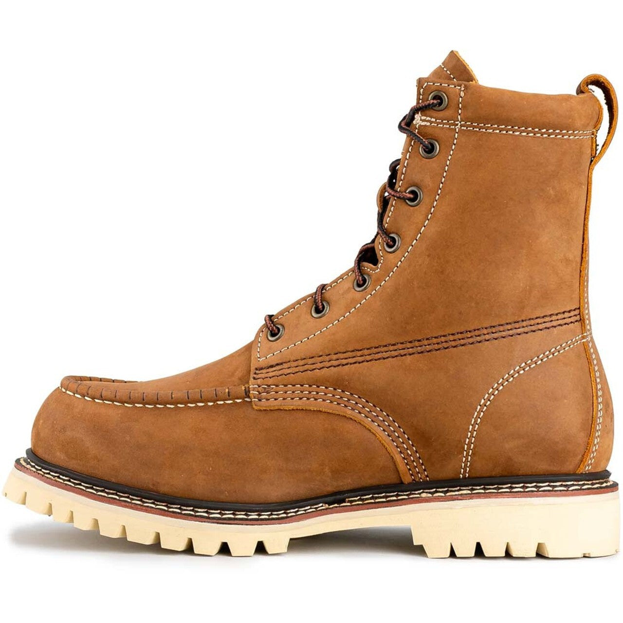 Built for extreme conditions, the Bonanza Summit 8” Insulated Waterproof Moc Toe Work Boot in Crazy Brown is designed to handle demanding jobs while keeping your feet dry, warm, and comfortable. Crafted from premium water-resistant full-grain Crazy Horse leather, these boots offer rugged durability and long-lasting protection. A waterproof membrane combined with a breathable mesh lining ensures moisture stays out while maintaining airflow. With 420g insulation, your feet stay warm in harsh weather, making these boots a reliable choice for cold environments. The removable shock-absorbing PU insole enhances comfort, while the non-marking, high-abrasion, oil- and slip-resistant rubber outsole provides superior traction on any surface. Reinforced with 360° Goodyear welt construction, these boots are made to last. A steel toe option (BAT-834) is available for enhanced protection, meeting ASTM F2413-18 standards.